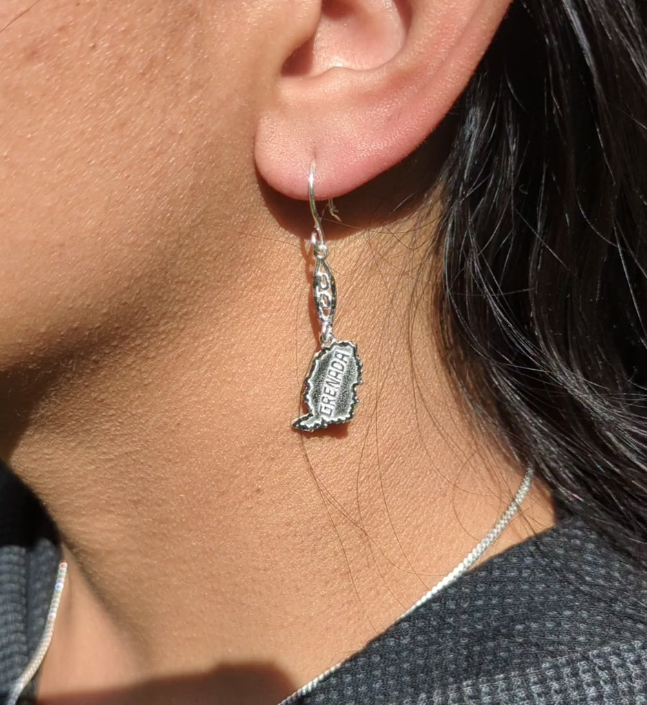 Caribbijou handmade Grenada Map hanging earrings.